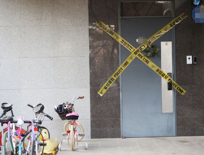 8일 오전 온몸에 멍든 채 숨진 초등학생 A(12)군이 살던 인천시 남동구 한 아파트 현관 앞에 자전거들이 놓여 있다. 경찰은 전날 아동학대치사 혐의로 친부 B(39)씨와 계모 C(42)씨를 긴급체포해 조사하고 있다. 연합뉴스