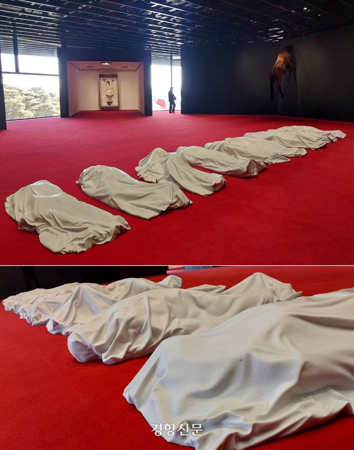 카텔란은 리움미술관 전시장 입구(사진)와 로비에 노숙자를 형상화한 작품 ‘동훈과 준호’(2023, 나무, 스티로폼, 스테인리스 스틸, 옷, 신발, 소품, 가변크기)를 설치해 한국의 노숙자 문제를 상기시킨다. 도재기기자