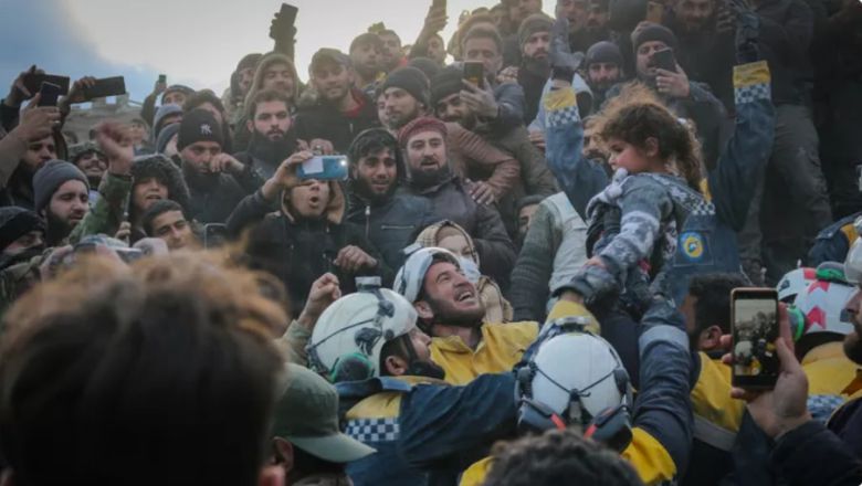 7일(현지 시각) 시리아 북서부 지진 피해 현장에서 '하얀 헬멧' 구조대가 한 소녀를 구조했다. / 하얀 헬멧 트위터 갈무리 |