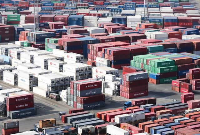 부산항 신선대 부두 야적장에 컨테이너가 가득 쌓여 있는 모습. |