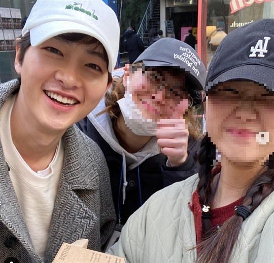 사진 속 송중기는 연극 '독' 관람 후 연극 배우들과 기념 사진을 찍은 듯하다. 송중기는 꾸밈없는 내추럴한 모습으로 눈길을 사로잡는다.