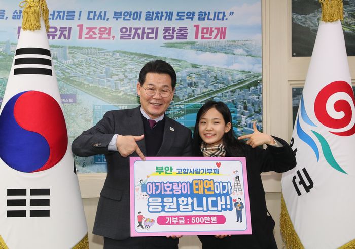 부안 출신 트로트 가수 김태연양이 부안군에 고향사랑기부금 500만원을 기탁하고 있다. 부안군 제공