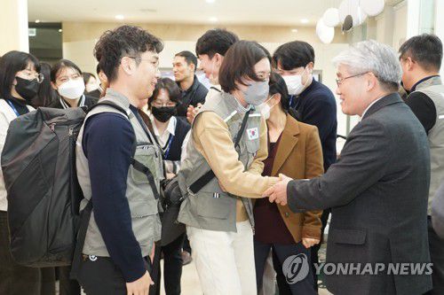 (서울=연합뉴스) 홍석화 코이카 사업전략·파트너십본부 이사(오른쪽)가 지난 7일 경기도 성남시 코이카 본부에서 튀르키예 지진피해 지원 대한민국 긴급구호대(KDRT) 파견을 앞둔 류선길 대원, 백주영 대원을 격려하고 있다. 2023.2.8 [코이카 제공. 재판매 및 DB 금지]
