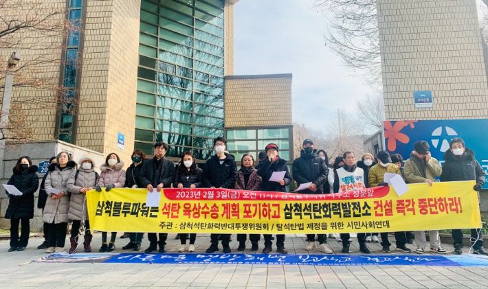 탈석탄법 제정을 위한 시민사회연대와 삼척석탄화력반대투쟁위원회는 지난 3일 삼척블루파워 앞에서 기자회견을 열고 화력발전소의 석탄 육송운송 추진 계획을 포기할 것을 촉구했다. 삼척석탄화력반대투쟁위 제공