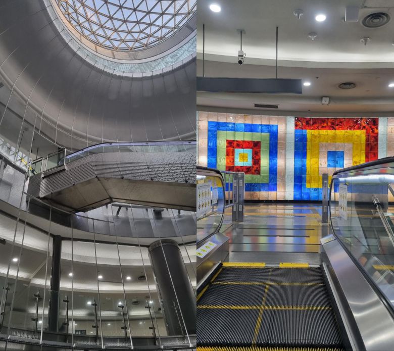 여느 지하철역과는 하나 다른 것이 있었다. 역사 천장에 자연광을 유도하는 대형 유리 선큰(sunken)을 설치해, 지하4층까지 자연 채광이 닿도록 했다. 실제로 바깥에서 들어오는 자연광에 내부에 켜둔 조명까지 더해져 실내는 꽤 밝았다. 역의 공용공간 규모도 공덕, 강남 역보다는 작았지만, 마포역이나 뚝섬역 등에 비해서는 훨씬 커보였다.