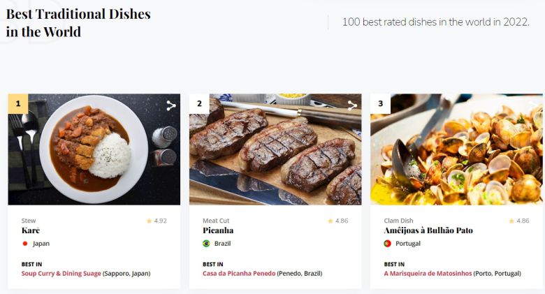 테이스트 아틀라스가 선정한 2022년 세계 최고의 전통 요리 50선을 보면, 1위는 일본의 카레가 꼽혔다. 2위는 브라질의 피카냐, 3위는 포르투갈의 아메이조아스 아 불량 파투, 4위는 중국의 탕바오다.일본 음식은 카레 외에도 돈코츠 라멘, 가츠동, 쇼유라멘, 연어스시, 교자만두 등이 순위권에 들었다.
