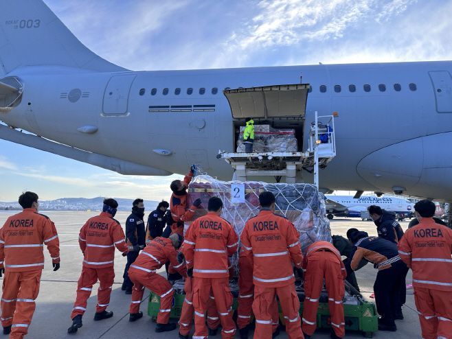 튀르키예 강진 피해를 수습할 대한민국 긴급구호대가 8일 오전 튀르키예 가지안테프 국제공항에 도착해 구호 장비를 하역하고 있다. /제공=대한민국 긴급구호대