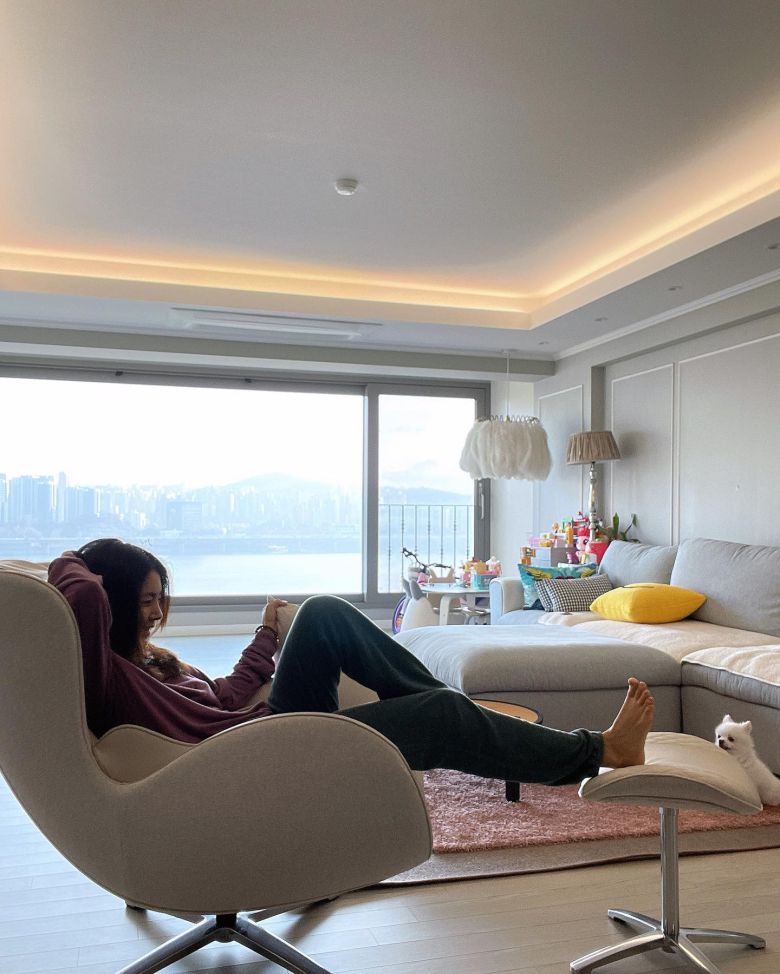 특히 한채아의 여유로운 모습 너머로 보이는 커다란 통창으로 보이는 그림같은 한강뷰가 시선을 사로잡았다.