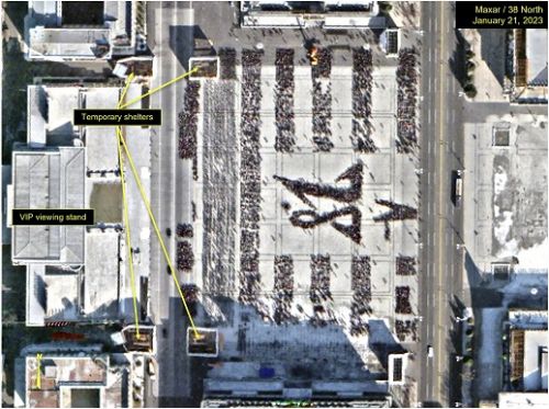 지난 21일 상업 위성사진에 포착된 북한이 평양 김일성 광장에서 열병식을 준비하는 모습. 38노스 캡처 |