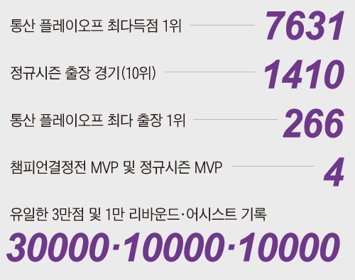 경기가 잠시 멈춘 사이 1984년 기록을 세웠던 직전 1위 카림 압둘자바(76·3만8387점)가 코트에 나와 제임스를 직접 안아주며 축하의 인사를 건넸다. 제임스는 “NBA 역사를 읽을 때 이 기록에 손이 닿을 거라고는 생각도 하지 못했다”면서 “가족, 친구들, 어머니가 없었다면 지금의 나도 없을 것”이라고 하면서 울먹였다.