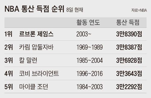 19년의 시간이 지난 뒤, 제임스는 8일 오클라호마시티 선더와의 홈 경기에서 3쿼터 종료 10초를 남기고 안정적인 포스트업으로 수비수를 밀어붙였다. 그리고 자유투 라인 부근에서 드리블과 함께 한 발짝 뒤로 물러나더니 바로 중거리슛을 쐈다. 공은 아름다운 궤적을 그리면서 골대 안으로 빨려 들어갔다. 제임스의 NBA 통산 3만8388점째 득점. 제임스가 19년 전 약점으로 평가받았던 모든 기술들을 자유자재로 구사하며 현재 그가 속한 레이커스의 전설 중 하나인 카림 압둘자바를 제치고 통산 득점 1위에 오르는 장면이었다.