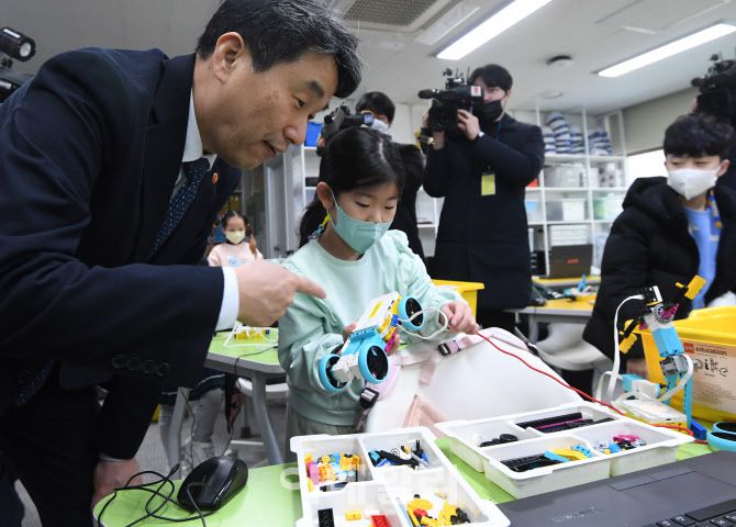 [이데일리 이영훈 기자] 이주호 사회부총리 겸 교육부 장관이 9일 오전 서울 서대문구 서울가재울초등학교에서 늘봄학교 관련 학교현장을 방문해 한 학생이 만든 자동차 코딩로봇에 대해 설명을 듣고 있다.