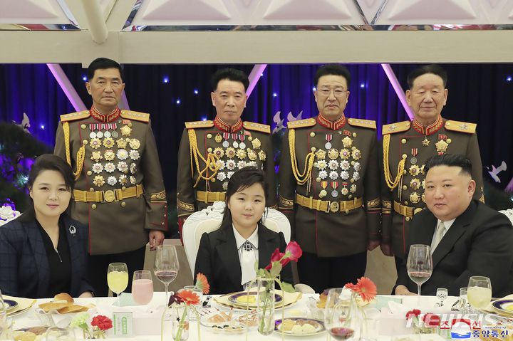 [평양=AP/뉴시스] 북한 조선중앙통신이 제공한 사진에 김정은(오른쪽) 북한 국무위원장이 부인 리설주(왼쪽), 딸 주애와 함께 7일 장소가 알려지지 않은 곳에서 열린 조선인민군 창건(건군절) 75주년 기념 연회에 참석해 장성들과 기념 촬영을 하고 있다. 2023.02.08.