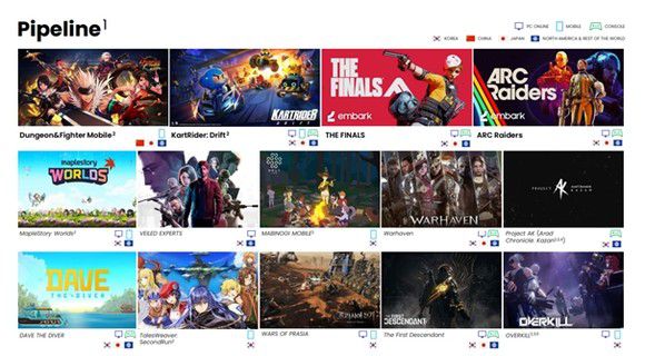 ◆넥슨, 올해 파이프라인 공개…글로벌 게임 시장 저격 시동=넥슨은 오랜 기간 서비스해온 라이브 타이틀뿐만 아니라, 앞으로 선보일 신작들에도 소통을 중심으로 하는 라이브 운영 문법을 적용할 계획이다. 넥슨은 ▲워헤이븐 ▲더파이널스 ▲퍼스트디센던트 ▲프라시아전기 등 신규 IP 및 크로스플랫폼 라인업을 늘릴 예정이다.
