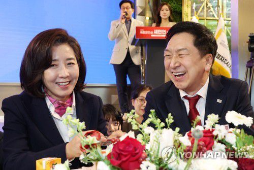 김 후보와 전당대회 불출마를 선언한 나 전 의원이 공개회동 한 지 이틀 만이다. 두 사람은 이날 오후 마포구에서 열린 보수 시민단체 '새로운 민심' 전국대회 행사에서 한 테이블에 나란히 자리했다.
