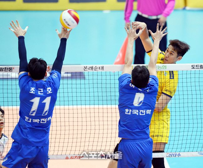KB손해보험 한성정이 9일 의정부체육관에서 열린 2022~2023 V-리그 한국전력과 경기에서 스파이크를 날리고 있다.