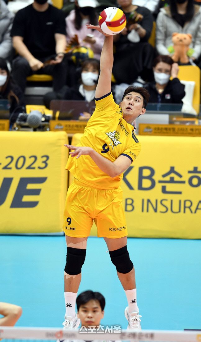 KB손해보험 한성정이 9일 의정부체육관에서 열린 2022~2023 V-리그 한국전력과 경기에서 서브를 넣고 있다.