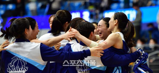 신한 김소니아가 9일 도원체육관에서 열린 2022-2023 WKBL 신한에스버드와 KB스타즈의 경기 4쿼터 막판 동점슛에 이어 보너스원샷까지 얻어내며 역전승의 발판을 마련했다. 1점차 승리 후 한채진과 자축하는 김소니아. 2023.2.9.