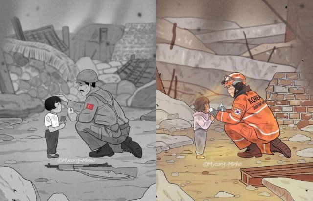 만화 일러스트레이터 명민호 작가는 지난 10일 자신의 인스타그램에 그림 두 장을 나란히 게시했다. 한국전쟁 당시 전쟁고아를 돌봐준 튀르키예 군인의 모습과 최근 지진이 덮친 튀르키예에서 아이를 돕고 있는 한국 긴급구호대의 모습이 담겼다.