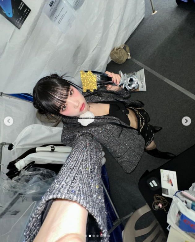 사진 속 최예나는 트로피를 손에 든 채 한 손을 쭉 뻗어 셀카를 찍고 있다.