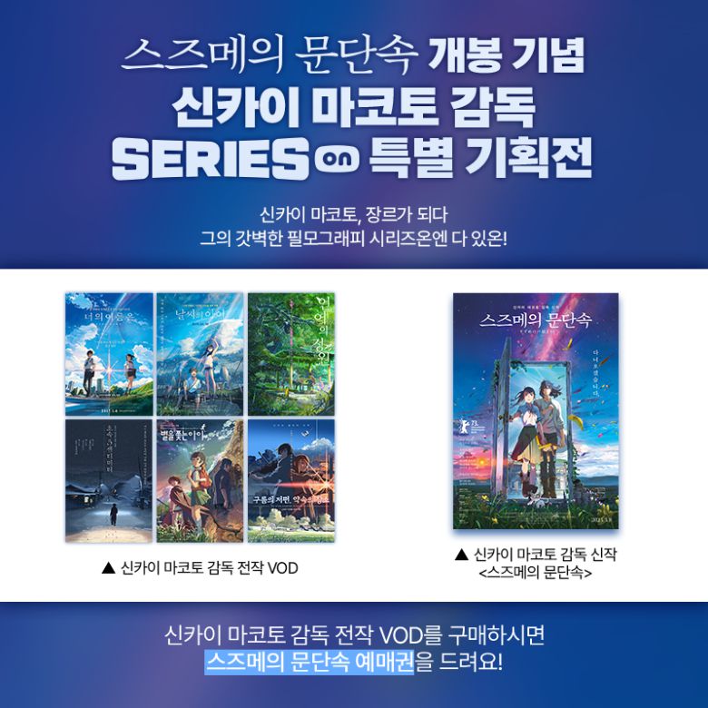 특히 네이버 시리즈온에서 신카이 마코토 감독의 전작 VOD 구매자들을 대상으로 '스즈메의 문단속' 예매권을 제공하는 이벤트도 진행한다.