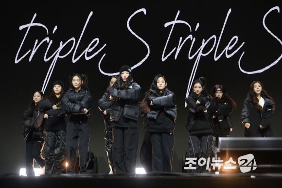 그룹 트리플에스가 13일 오후 서울 용산구 한남동 블루스퀘어 마스터카드홀에서 열린 트리플에스(tripleS) 10인조 디멘션 첫 앨범 '어셈블(ASSEMBLE)' 발매 쇼케이스에서 타이틀곡 '라이징' 무대를 선보이고 있다. [사진=정소희 기자]