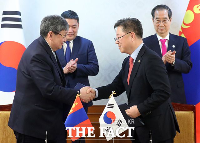 [더팩트ㅣ이동률 기자] 박일준 산업통상자원부 2차관과 후렐바타르 몽골 경제부총리 겸 경제개발부 장관이 15일 오전 서울 종로구 정부서울청사에서 EPA 협상 개시 추진 공동선언문에 서명한 뒤 악수하고 있다.