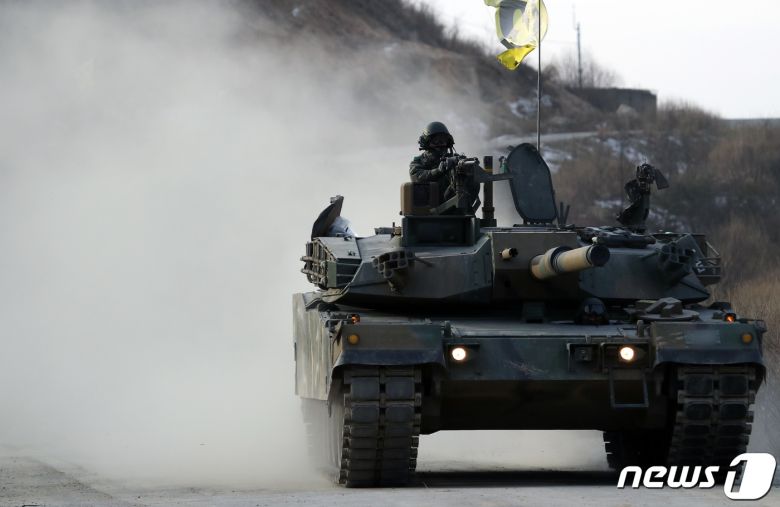 (포천=뉴스1) 이동해 기자 = 육군 17보병사단 전차가 15일 경기도 포천 승진과학화훈련장에서 열린 제병협동전투사격 훈련에서 적 장애물 지대 개척을 위해 기동하고 있다. 이번 훈련은 장병 300여명과 K1E1 전차, KM9ACE 전투장갑도저, K808 차륜형 장갑차, 500MD 공격헬기 등 지상과 항공을 아우리는 장비 30여 대가 투입되어 실전적이고 강도 높게 진행됐다. 2023.2.15/뉴스1