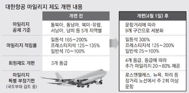 이는 4월 개편될 대한항공 새 마일리지 제도에 대한 소비자 불만이 커진 데에 따른 것이다. 새 마일리지 제도는 좌석 승급 마일리지 공제 기준을 ‘지역’에서 ‘운항 거리’로 변경하는 게 골자다. 현재는 국내선 1개와 국제선 4개 지역별로 마일리지를 공제한다. 제도가 바뀌면 거리에 따라 국내선 1개와 국제선 10개로 기준이 세분된다. 이 경우 인천∼뉴욕 구간(편도)을 구매하기 위한 마일리지가 이코노미석은 3만5000마일에서 4만5000마일로, 프레스티지석은 6만2500마일에서 9만 마일로, 일등석은 8만 마일에서 13만5000마일로 늘어난다. 소비자들은 마일리지 항공 좌석 자체도 부족해 쓰기 어려운 데다 대한항공이 주요 장거리 노선을 사실상 독점하면서 마일리지 공제폭을 높였다고 비판했다.