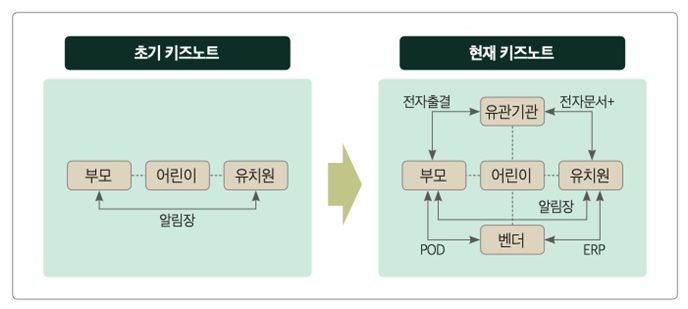 키즈노트는 보육기관과 부모가 커뮤니케이션을 할 수 있게 해주는 단순한 구조의 플랫폼으로 출발했다. 하지만 사업 영역이 점점 확장되면서 키즈노트 플랫폼은 더욱 많은 기관과 판매자를 품는 형태로 자연스럽게 진화다. 키즈노트는 이제 말 그대로 영유아 보육과 관련된 거의 모든 이해 관계자들이 소통할 수 있도록 하고 이들의 거래를 이어주는 플랫폼으로 성장하게 되었다.