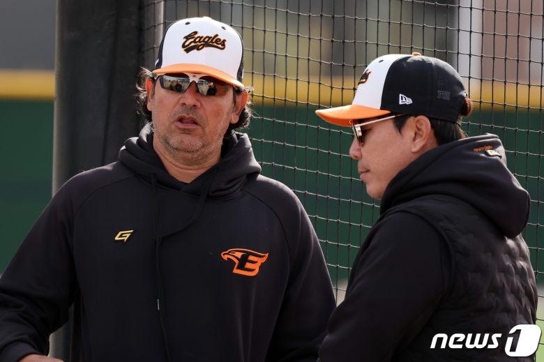 (애리조나(미국)=뉴스1) 황기선 기자 = 한화 이글스 수베로 감독과 이대진 수석코치가 18일(현지시간) 미국 애리조나주 메사 벨뱅크파크에서 열린 '2023 한화 스프링캠프'에서 대화를 나누고 있다. 2023.2.19/뉴스1juanito@news1.krCopyright ⓒ 뉴스1. All rights reserved. 무단 전재 및 재배포 금지.이 기사의 카테고리는 언론사의 분류를 따릅니다.0공유하기