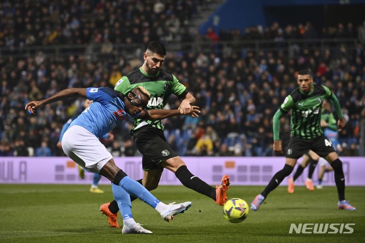[레조 에밀리아=AP/뉴시스] 나폴리의 빅터 오시멘이 17일(현지시간) 이탈리아 레조 에밀리아의 마페이 스타디움에서 열린 2022-23시즌 세리에A 23라운드 사수올로와의 경기 전반 33분 팀의 두 번째 골을 넣고 있다. 오시멘은 7경기 연속 골을 넣으며 리그 득점 1위(18골)를 기록하고 있고 나폴리는 2-0으로 승리해 리그 1위를 굳게 지켰다. 2023.02.18.