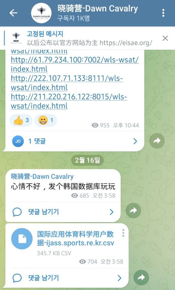 18일 보안업계에 따르면 '샤오치잉(Xiaoqiying, 晓骑营)'이라고 자칭하는 해커조직은 지난 16일 자신들이 운영하는 텔레그램 채널을 통해 800여건의 개인정보가 들어있는 데이터베이스를 유출했다. 이들이 탈취했다고 주장하는 데이터베이스는 한국스포츠정책과학원이 운영하는 영문저널(IJASS) 관련 회원 정보인 것으로 추정된다. 이 기관은 체육진흥공단 산하 연구기관이다.