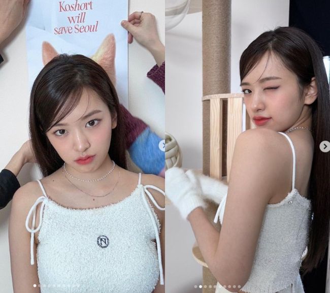또 다른 사진 속 안유진은 고양이 캣타워 옆에서 윙크하는 모습이 담겨있다. 뿐만 아니라 안유진은 대형 고향이 사진 옆에서 올 블랙 패션으로 포즈를 취하며 촬영에 집중했다.