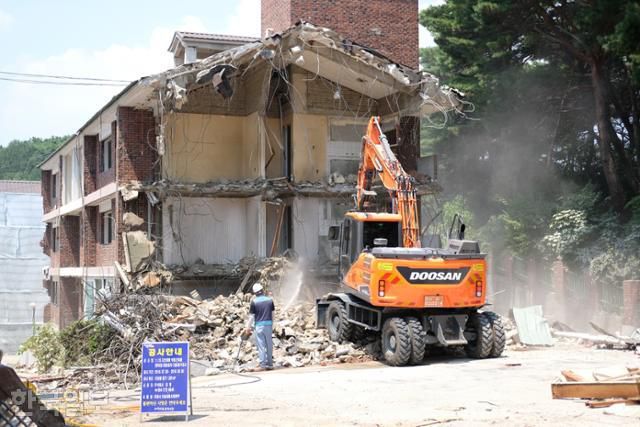 2017년 경북 포항 지진으로 부서진 한 아파트가 철거되고 있다. 한국일보 자료사진 |