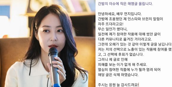 이어 "그러니 제 글로 인해 피해를 보는 이가 없게 해주세요. 열심히 참여한 작품에 누가 될까 염려되어 해당 글을 삭제했다"고 덧붙였다.