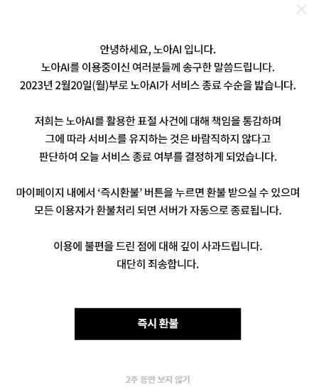 노아AI는 "노아AI를 활용한 표절 사건에 대해 책임을 통감하며 그에 따라 서비스를 유지하는 것은 바람직하지 않다고 판단했다"며 "모든 이용자가 환불처리되면 서버가 자동으로 종료된다"고 알렸다.