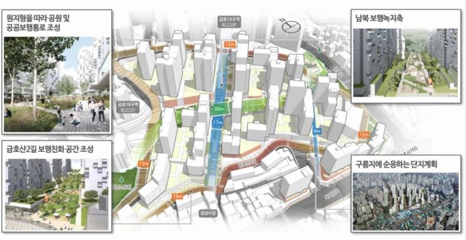 경사지에 조성되는 공동주택 단지인 만큼 다양한 높이의 주동 배치를 통해 한강변에서 바라볼 때 다채로운 경관이 실현되도록 한다. 아울러 금호21구역은 '금호지구중심 지구단위계획'과 금남시장과 닿아 있어 상업가로를 연계해 조성할 예정이다.