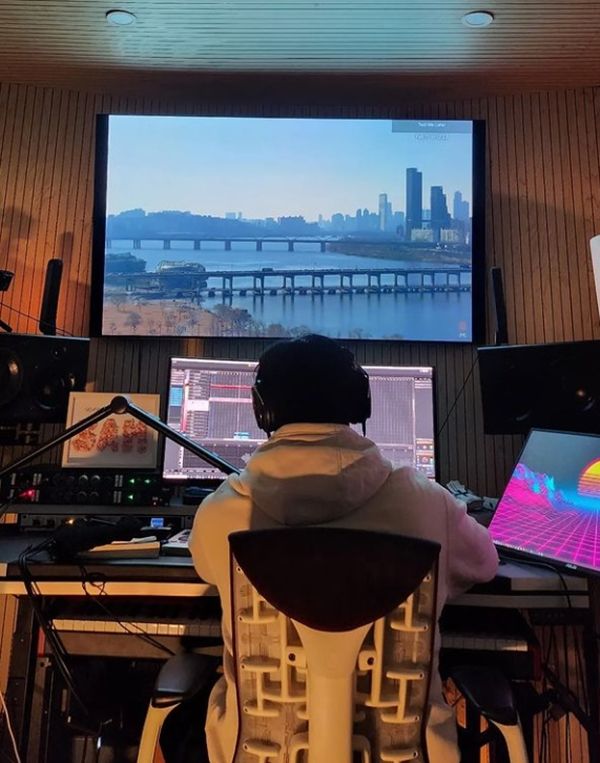 함께 공개된 사진에는 컴퓨터 앞에서 음악 작업 중인 샘김의 뒷모습이 담겼다. 전면 스크린에는 한강 풍경이 보인다.