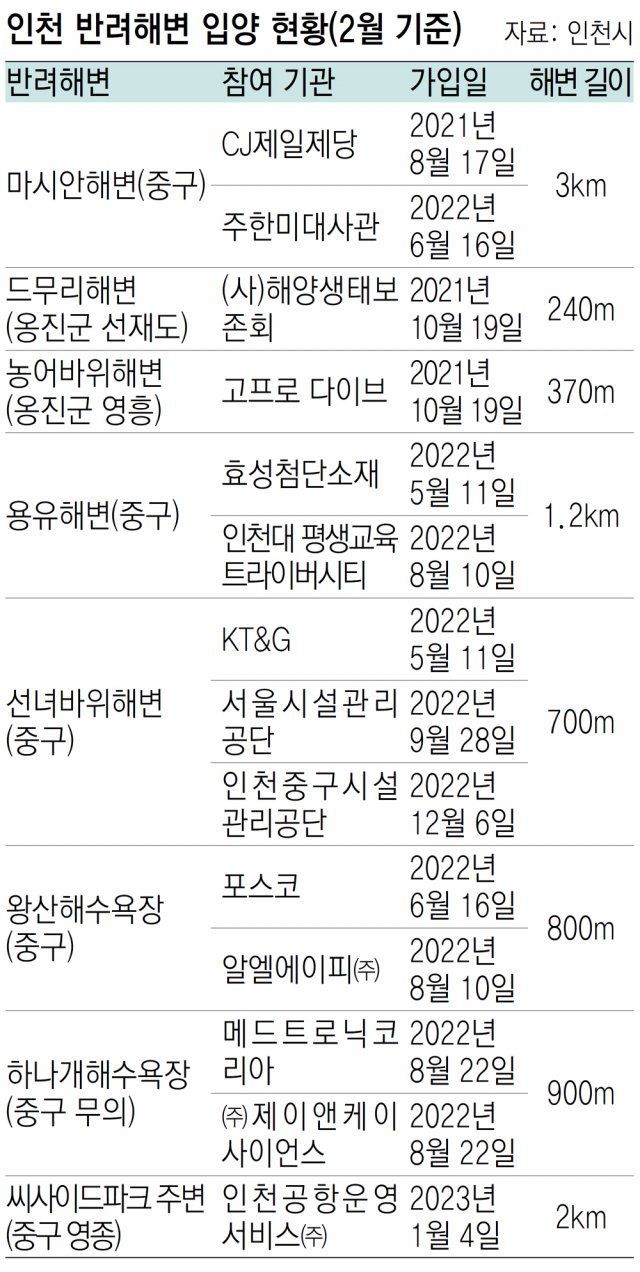 2021년 3개였던 반려해변 가입 기업은 지난해 13개로 4배 이상으로 늘었으며 각 기업이 지정·관리하는 해변도 8개로 증가했다. 올 1월에는 인천공항운영서비스㈜가 영종 씨사이드파크 주변 해변을 입양하는 등 기업의 참여가 꾸준히 늘고 있다.