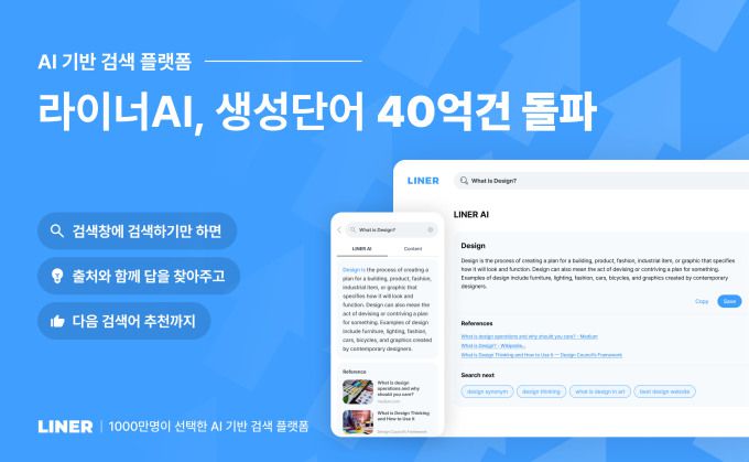 [서울=뉴스핌] 양태훈 기자 = 라이너는 23일 자사 인공지능(AI) 검색 서비스 '라이너AI(LINER AI)'가 출시 3주 만에 유저 검색을 통한 생성단어 40억 건을 돌파했다고 밝혔다.