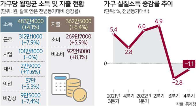 통계청이 23일 발표한 ‘2022년 4분기 가계동향조사’ 결과를 보면 지난해 4분기 가구당 월평균 소득은 483만4000원으로, 1년 전보다 4.1% 늘었다.