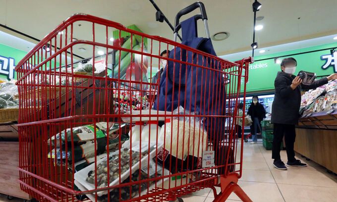 통계청이 23일 발표한 '2022년 4분기 가계동향조사'에 따르면, 지난해 4분기 가계소득이 고용 증가와 임금 상승 등에 힘입어 늘어났지만, 고물가 탓에 실질소득은 오히려 감소한 것으로 나타났다. 사진은 이날 서울의 한 대형마트에서 시민들이 장을 보는 모습. 뉴스1 |