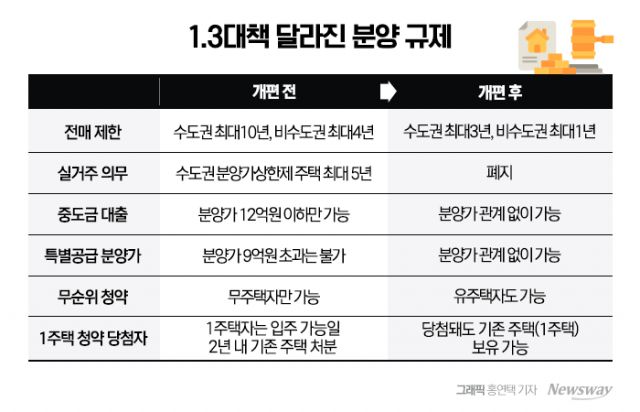 앞서 정부는 1·3 대책 발표를 통해 서울 강남·서초·송파·용산구를 제외한 전 지역을 규제지역에서 해제했다. 주택전매제한 기간 역시 각각 수도권은 10년에서 3년으로, 비수도권 지역은 4년에서 1년으로 대폭 단축되며, 수도권 분양가 상한제 주택 등에 적용되는 실거주 의무도 폐지된다.