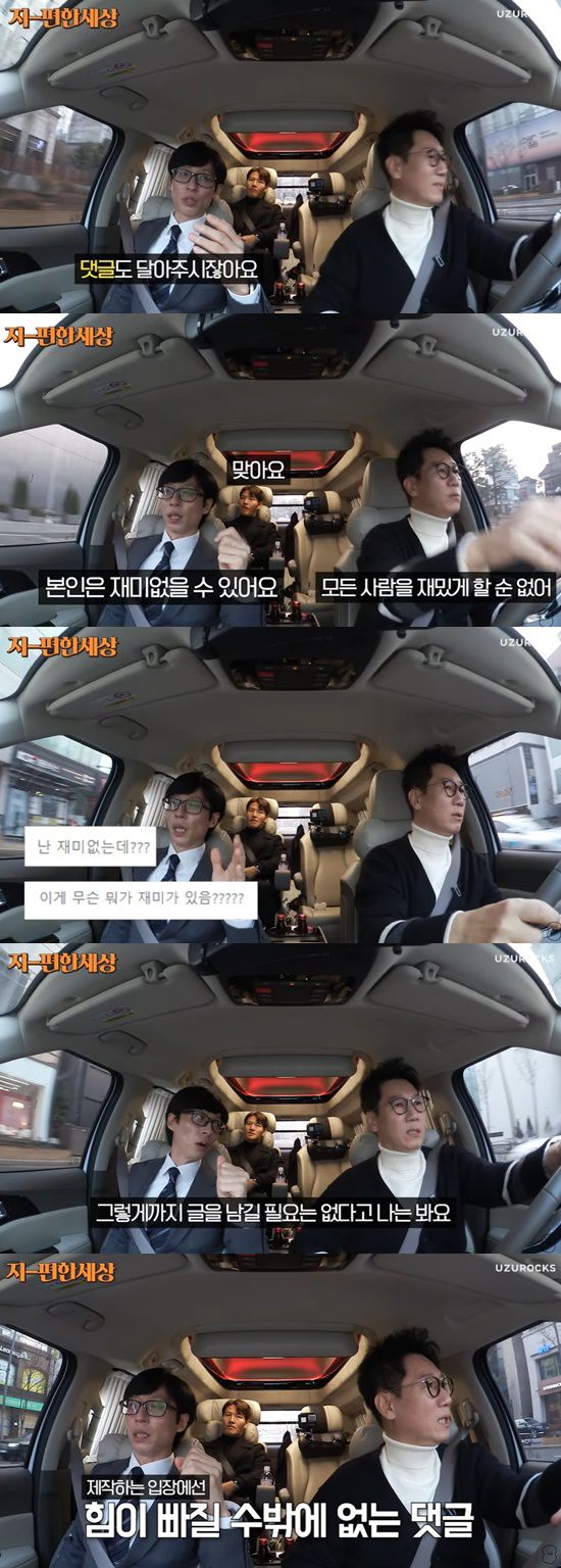 이어 유재석은 "보면 시청자분들이나 방송을 보시는 분들이 댓글을 달아주시지 않나. 보는 콘텐츠에 따라 본인은 재미없을 수 있다. 그런데 그렇다고 해서 '난 재미없는데?', '이게 무슨 재미가 있음?' 이렇게까지 글을 남길 필요는 없다고 본다"고 주장했다.