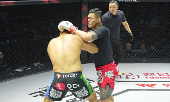 지난 25일 황인수(오른쪽)가 고양종합체육관에서 열린 로드FC 063에서 가진 무제한급 킥복싱 룰 이벤트 매치에서 명현만에게 공격을 시도하고 있다. 로드FC 제공 |