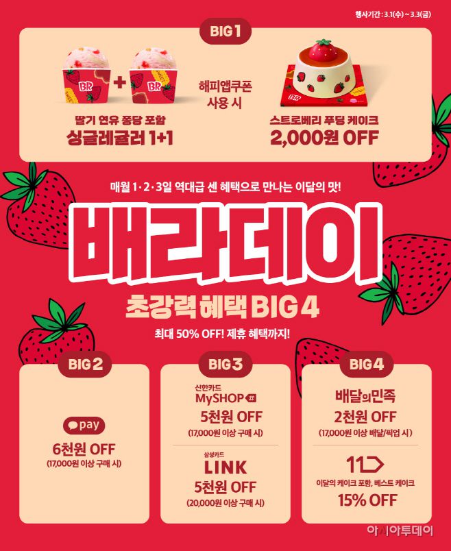 배스킨라빈스는 '딸기 연유 퐁당' 출시를 기념해 3월 1일부터 3일까지 '배라데이'를 실시한다. 해피포인트 애플리케이션(해피앱) 이벤트 페이지에서 3월 이달의 맛 '싱글 레귤러 1+1' 또는 '이달의 케이크 2000원 혜택' 쿠폰을 지급한다.