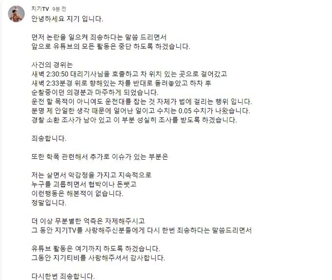 헬스 유튜브 ‘지기TV’가 음주 운전 논란 사과문을 올리며 유튜브 활동을 전면 중단했다.