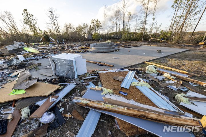 [셀마=AP/뉴시스] 12일(현지시간) 미 앨라배마주 셀마를 휩쓴 토네이도로 구조물이 파괴돼 잔해가 쌓여 있다. 미국 남부를 강타한 토네이도로 민권운동의 역사적 성지인 셀마의 주택이 파손되고 나무가 뿌리째 뽑히는 등 피해를 보았다. 2023.01.13. |