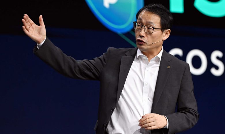구현모 KT 대표가 28일(현지시간) 스페인 바르셀로나 피라 그란 비아에서 열린 모바일 월드 콩그레스(MWC2023)에서 '협업을 위한 시간인가'를 주제로 키노트 연설 하고 있다.